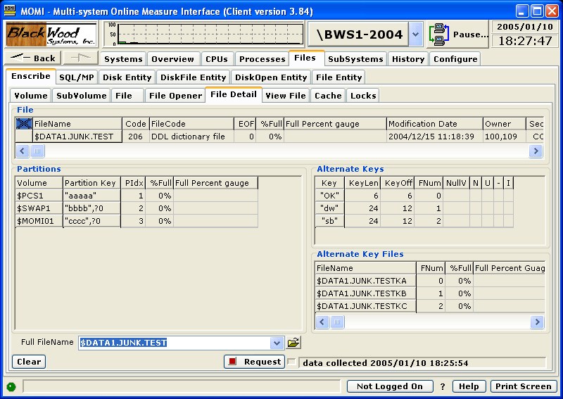 The Enscribe / File Detail screen presents details of the Partitions, Alternate Keys and Alternate Key Files associated with an Enscribe file.
