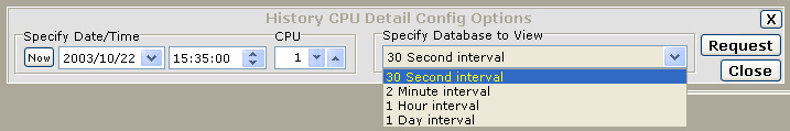 The Config button displays a pop-up window allowing the specific Date/Time, CPU and Database to retrieve the data.