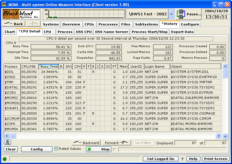 The History / CPU Detail screen presents details of a CPU and the processes in that CPU at a given point in time. Once data is displayed, scrolling forward and backward based on interval in time may be performed.
