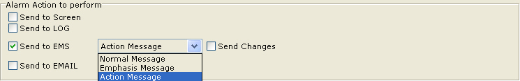 An EMS message has the attributes of Action, Emphasis and Normal. EMS messages are access on the screen EMS Msgs. Send Changes indicates that any change in the Alarm messages is logged. By default, only the first and last (or clear) are logged.