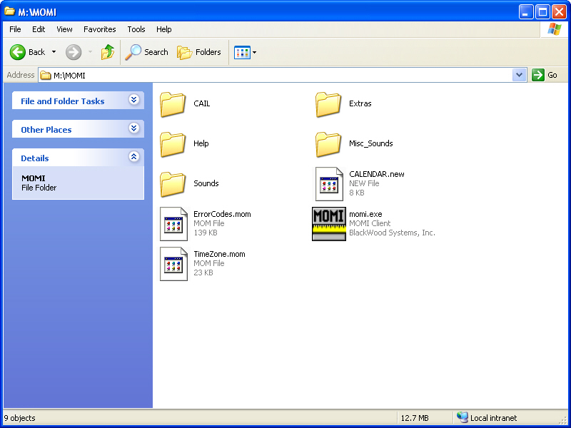 On a Shared drive M:, the administrator creates a subdirectory called \MOMI and copies into it all the files from "\PC Manual Install". The files and subdirectories shows in this example may change from release to release.