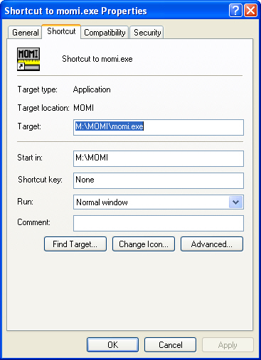 On each PC workstation, create a shortcut to the MOMI.EXE located in shared drive M:\MOMI.