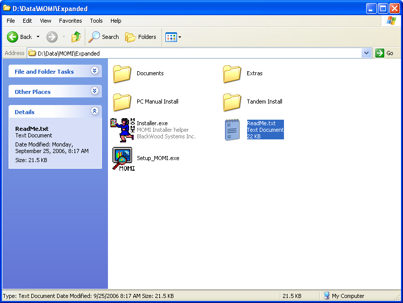 This example shows how to setup the MOMI PC on a shared subdirectory. The MOMI source files are obtained by renaming the EXE to a ZIP and expanding it to a work area.