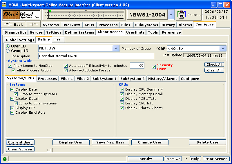 Individual users or Groups are given various permissions. The section System Wide area provides for general abilities such as allowing process actions or automatic Logoff. The tabbed area below selects what screens are available and other screen features.