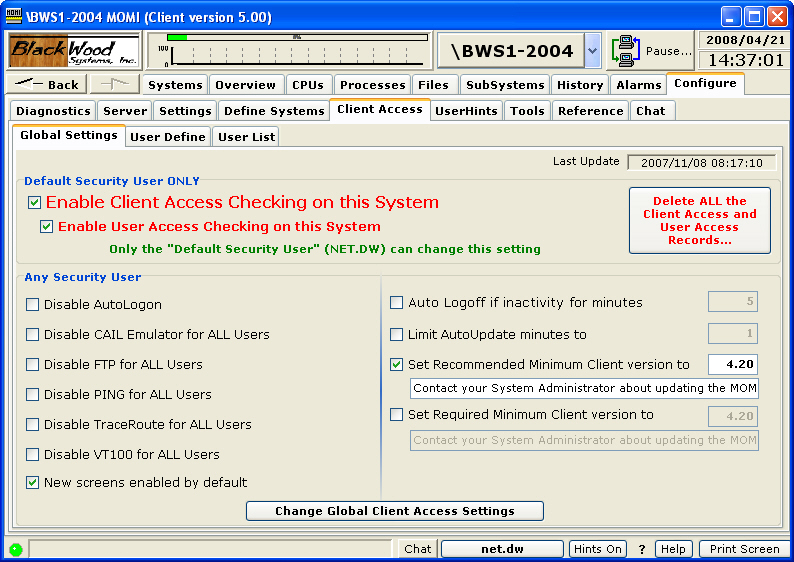 Enable Client Access Checking on this System is the overall activation/deactivation of Client Access. On the Default Security User may change this setting.