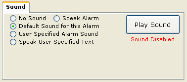 Sounds may be associated with an active Alarm. The available options are 1) speak the alarm, 2) a default or preselected message, 3) a user specified sound or 4) speak a user specified text string.
