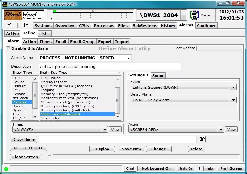 The Times drop-down box selects the monitor times for the alarm. The default of <ALWAYS> means monitoring is continuous.