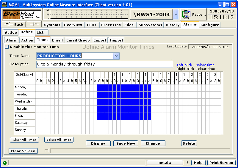 Place the mouse over a desired time period an press the left mouse button. Holding the button down and moving the mouse allows setting of multiple cells. Using the right mouse button clears cells. All cells may be set or cleared by clicking on the Clear All Times or Select All Times buttons.