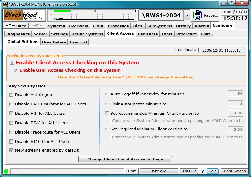 Enable Client Access Checking on this System is the overall activation/deactivation of Client Access. On the Default Security User may change this setting.