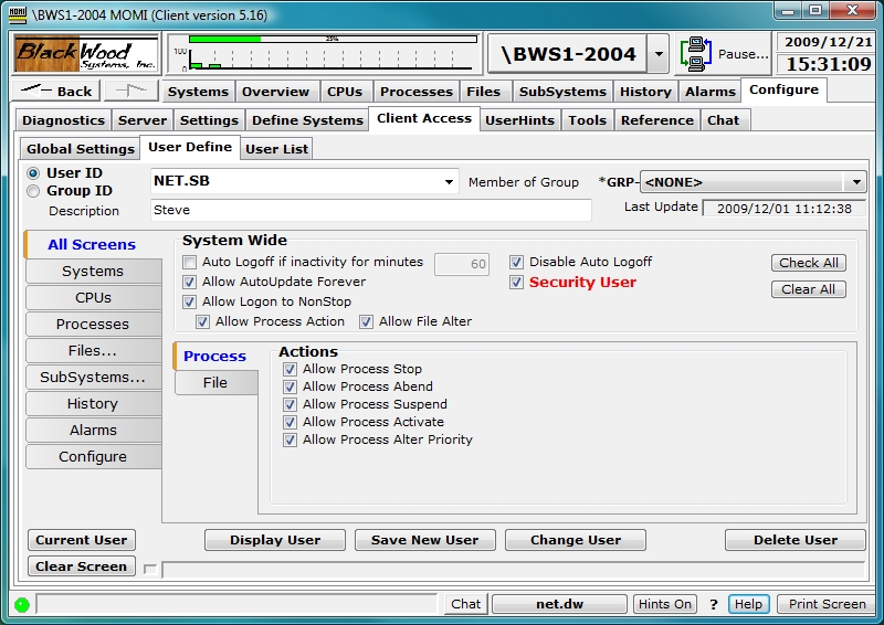 Individual users or Groups are given various permissions. The section System Wide area provides for general abilities such as allowing process actions or automatic Logoff. The tabbed area below selects what screens are available and other screen features.