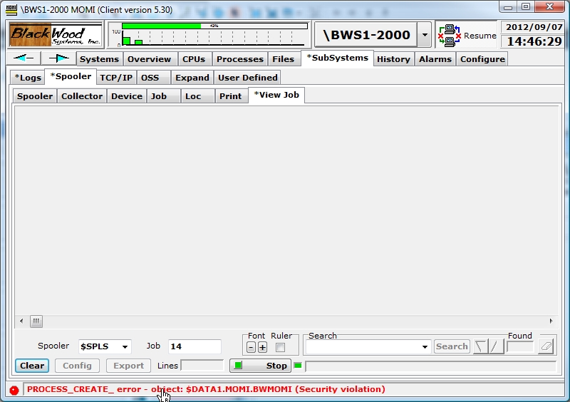 Special Note: If the MOMI executable on the NonStop System does not permit execute access to a Users credentials, the logon can be successful (assuming a valid User ID and password) but any subsequent sensitive command will fail indicating a PROCESS_CREATE_ error. MOMI starts a server under the users credentials to perform the sensitive command and at this point an error accessing the MOMI object file occurs. Below is an example of this error situation attempting to view the contents of a Spooler Job: