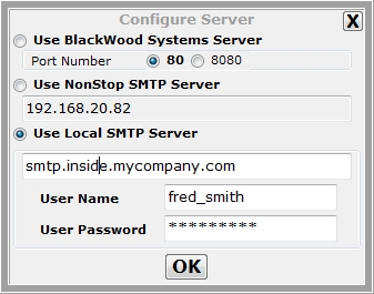 3) Use Local SMTP Server and manually enter an SMTP server DNS or IP-Address and optionally specify a User Name and Password (this User Name and Password provide secured access to the local SMTP server if required).