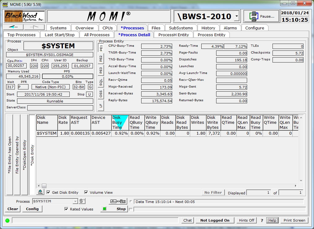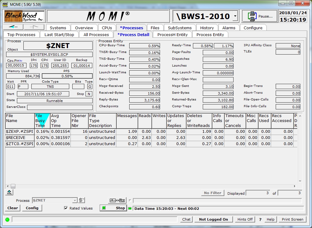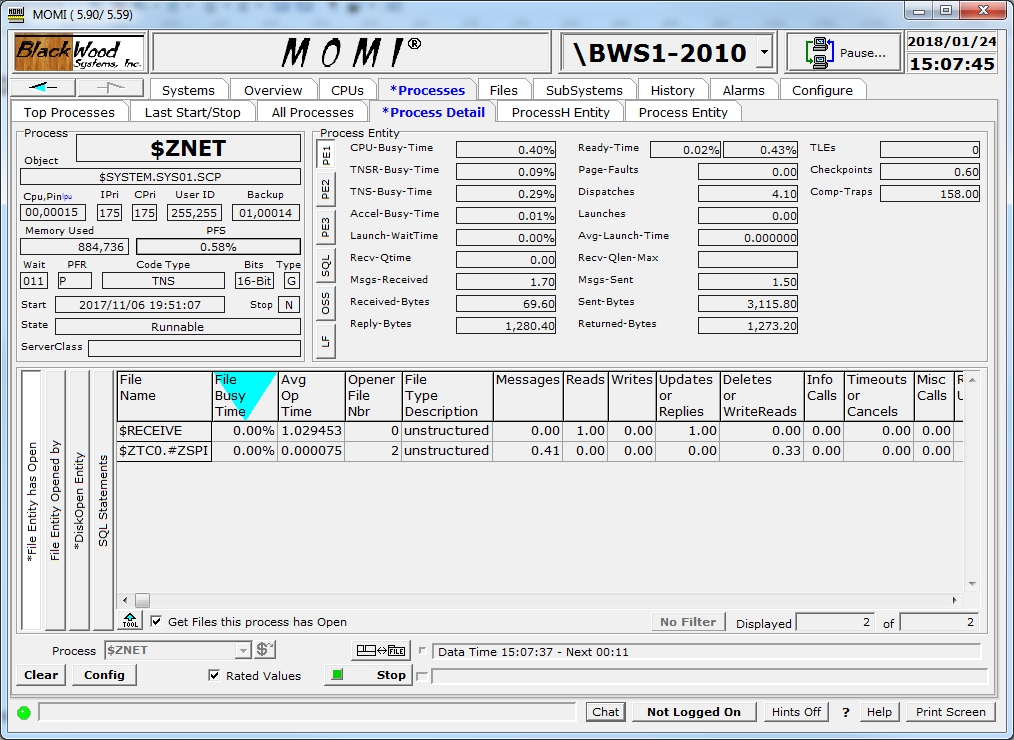 Values by default are rated in a "Per Second" mode such as 1.40 Comp-Traps. Uncheck the Rated box causes raw values to display. The window of time for the Process Entity is visible by pushing the Page 3 button. The window of time for the File, DiskOpen and SQL Statements entities are visible by scrolling all the way over to the right.