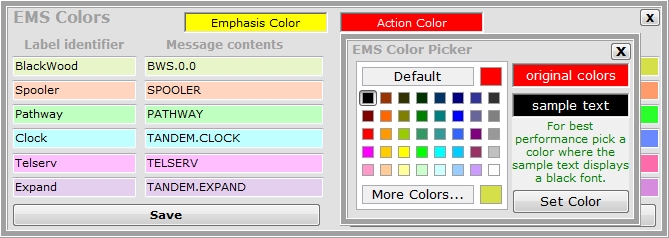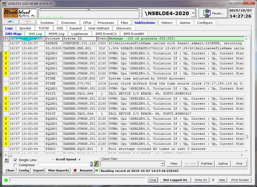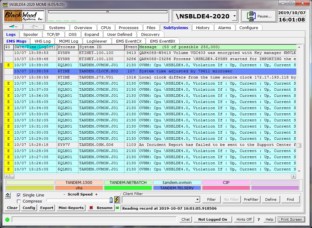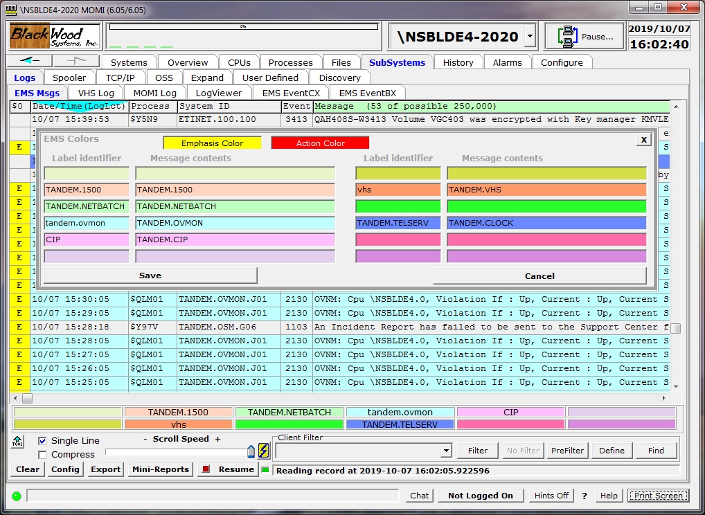The EMS Msgs screen presents information logged to an EMS collector or from an EMS log file. Messages may be displayed from one or more collectors and/or log files, filtered on-the-fly and color coded based on content.