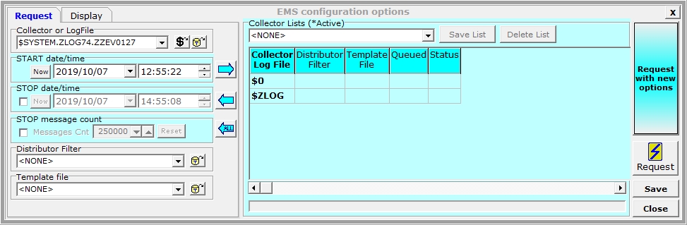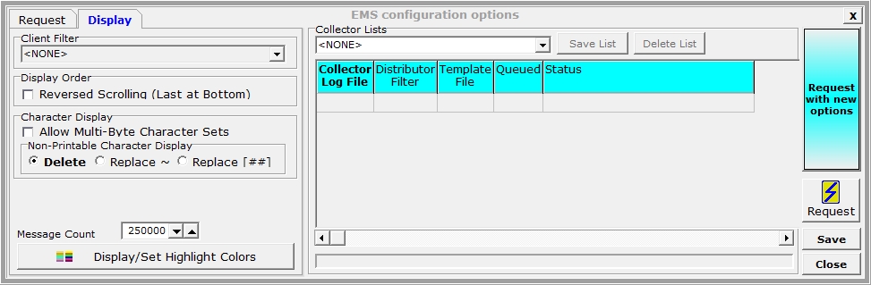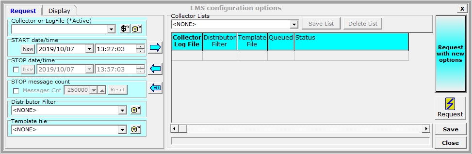 To view messages from an alternate EMS collector or to change other display options, press the Config button. In the pop-up window, enter or select the various fields. Press the right pointing arrow to add to the list and Request with new options when finished.