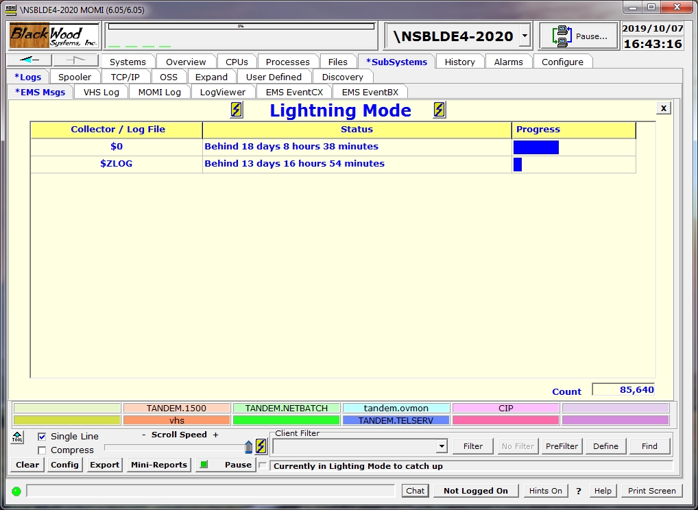 Entering Lightning Mode greatly reduces screen updates in order to allow incoming data to flow as quickly as possible. The Lightning Mode status screen remains until all Collector / Log Files reach the current time (or their configured stop time), End of File is reached or the pop-up itself is closed by clicking on the X. No EMS events are lost by entering, exiting, or re-entering Lightning Mode (i.e. you can freely exit and re-enter this mode as needed). The number of EMS events held in memory is still determined by Msg Count previously mentioned.