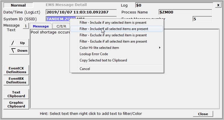The Filter button enables logic that alters only the display of the EMS messages with matching criteria. The messages are stored within memory and may be redisplayed by pressing the No Filter button. EMS messages are stored until the screen queue is filled and then the oldest message is discarded to make room for the newest.