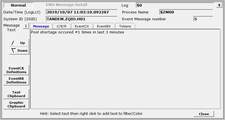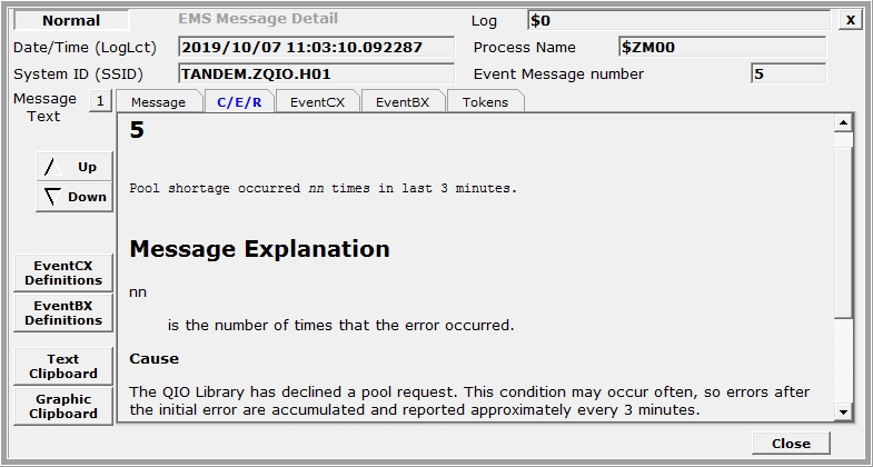 The C/E/R (Cause / Effect / Recovery) retrieves information from the EVENTTX file which provides detail about many system messages. Usually, it explains what caused the message, possible effects to the system, and makes recovery recommendations (if available). Each release or update to the NonStop O/S may alter these messages.