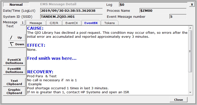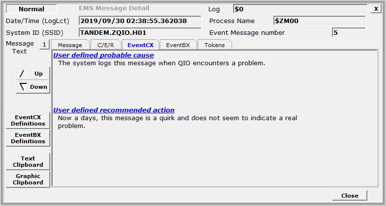 The EventCX tab displays any user defined information associated with the EMS message from this system defined file. Note that this file is usually EMPTY. See EVENTCX for additional information.