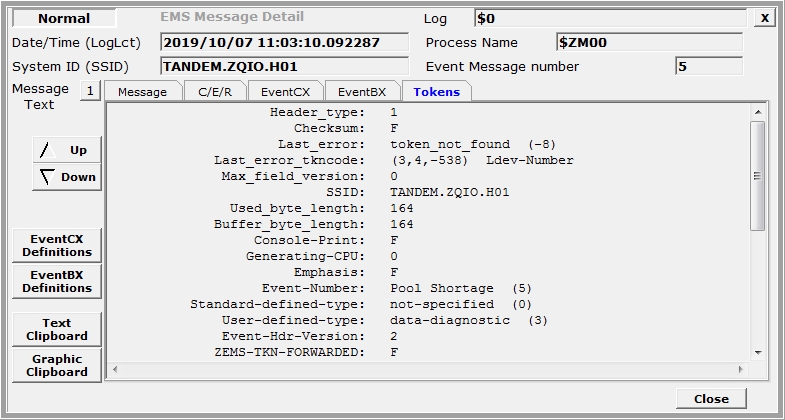 The Tokens tab contains all of the EMS tokens comprising the EMS message. Besides providing the raw event, sometimes additional information may be available as formatting templates do not necessarily translate all of the tokens into ASCII text.