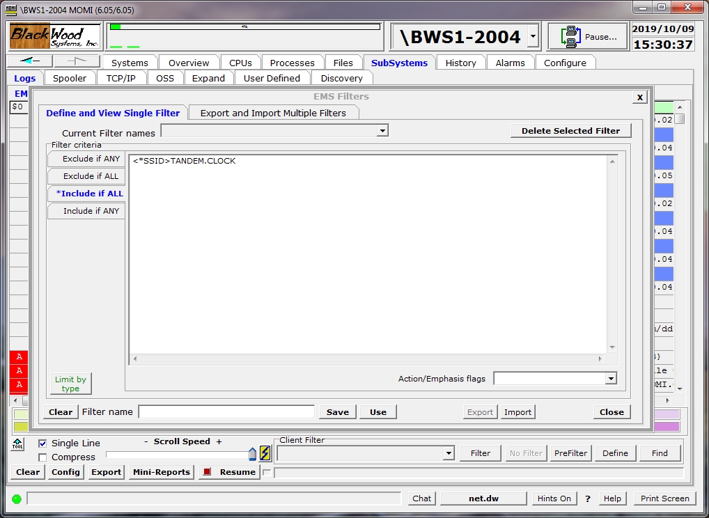 Filters constructed on-the-fly may be saved for later reuse. Press the Define button to display all of the current filter criteria. Saved filters may be viewed, edited, selected or deleted. Fields searched within the EMS message may be limited by the Limit by type button. In the sample image TANDEM.CLOCK is only searched in the SSID portion of the EMS message. If no limit is specified, the search is through the entire EMS message.