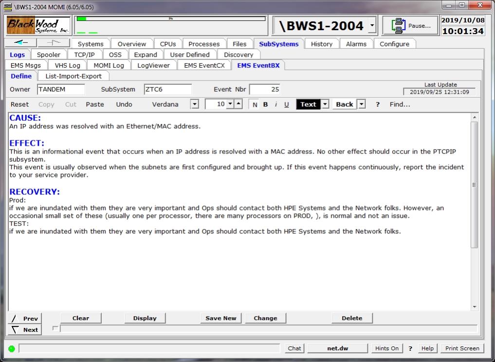 The EMS EventBX / Define screen provides for the creation and maintenance of user supplied information associated with an EMS message. The information is keyed by an EMS SSID (also known as the Owner.Subsystem) and event number.