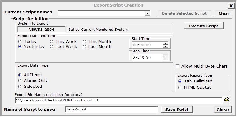 The Create Export Script button provides a means to define a script to define an export operation launched via the MOMI PC client run-time parameter SCRIPT-LOG. A script is defined and saved prior to referencing it via the run-time parameter. To place the current date within the Export File Name, in YYYYMMDD format, insert the field <date> (see the tool-tip over this field for an example).