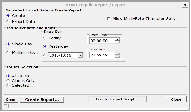 The Export button is used to generate a report, export records or create an export script. To create a report, under 1st select Create, under 2nd select a single day or multiple days, and under 3rd select to report on all records or on specific Alarm records. Press Create Report... to begin generation (a pop-up window is displayed to select the file name and location).