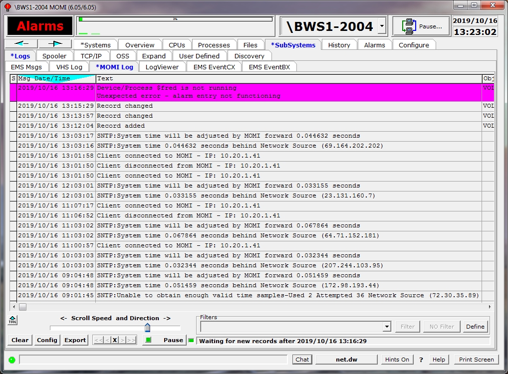 The MOMI Log screen displays records from the MOMI log file, provides an export capability and the definition of an export script. Records in this file are specific to MOMI.