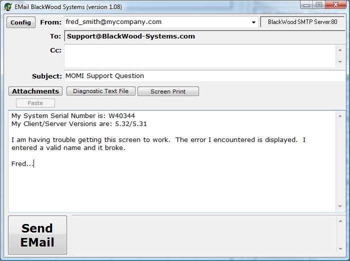 This selection displays the window below and captures the current PC MOMI Client screen. Additional screens may also be attached to the same email by selecting another screen within the MOMI PC Client again right-click on the Print Screen button and select Email BlackWood with Screen Print... (up to 30 screens may be attached in one message). Once all desired screens are captured, fill in the From with your email address and optionally add CC email addresses. In the body of the message type in any descriptive information concerning the problem or question (please try to give us enough detail so we may reproduce the problem or understand the question within the context of your environment). Push Send Email to transmit the data.