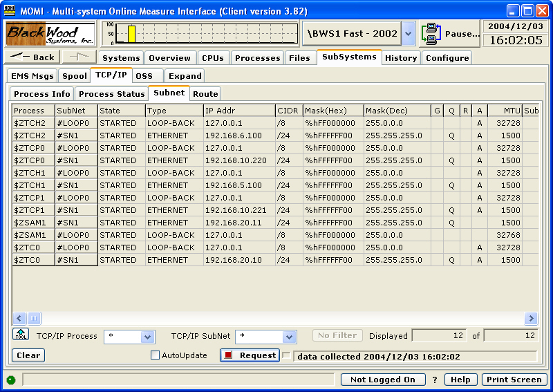 The TCP/IP / Subnet screen presents the status of the connection between the protocol stack and the physical LAN interfaces.