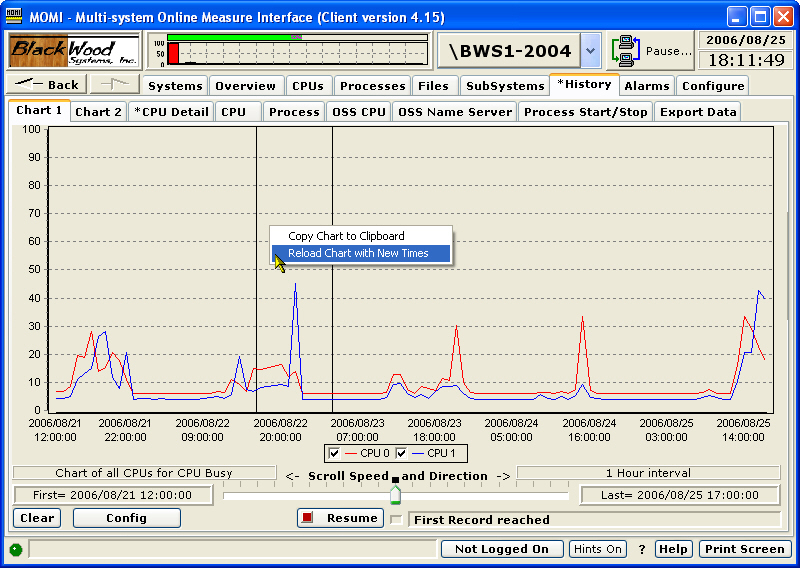 Right-clicking over a line will bring up a menu to allow 1) drill-down of that CPU and its processes, 2) display of all CPUs, 3) display of all processes or 4) bring up the Config screen and reload the chart with a New Time.
