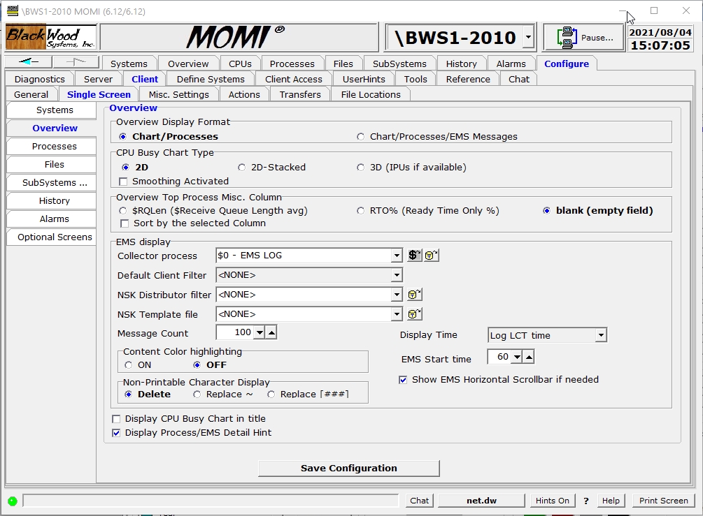 After making any change(s), press Save Configuration to cause the settings to be stored in the MOMI.INI file.